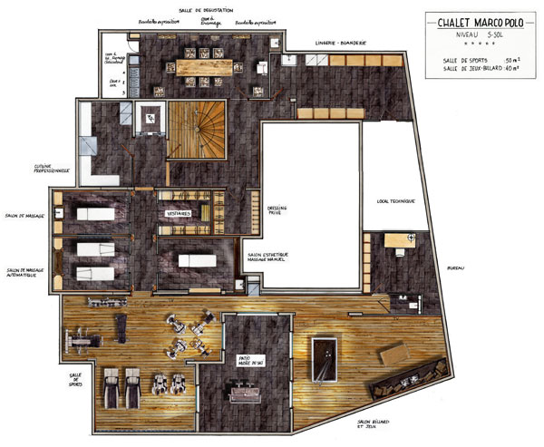 Descending into the heart of the chalet there are even more treats instore. The cave and fromagerie are perfect for wine and cheese tastings. The games and entertainment room comes complete with a pool table and darts board. The techno gym has two of everything, so you can workout in pairs. The classic massage room sits next to the automatic hydro massage room. Everything in this magnificent chalet is tailor made, creating the most extraordinary chalet in the alps.