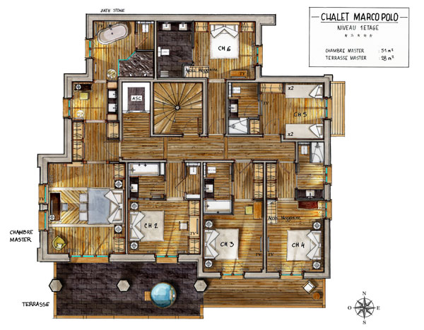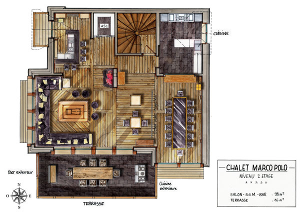 Bringing you 1000m² of Alpine chic, Marco Polo comfortably sleeps 12 adults and 2 children in six beautiful en-suite bedrooms. The living area is expansive with a large open plan living and dining area all set around a central fire place. The bar area is perfect for that pre-dinner cocktail and the cinema screen discreetly drops down from the high beams. Stretching out from the living area you will find a vast balcony, complete with panoramic views of La Face piste, an outdoor kitchen and heated seating.